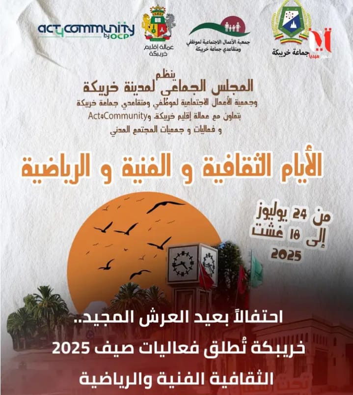 في إطار الاحتفالات بالذكرى السادسة والعشرين لتربع صاحب الجلالة الملك محمد السادس نصره الله على عرش أسلافه الميامين ، ينظم المجلس الجماعي لمدينة خريبكة وجمعية الأعمال الاجتماعية لموظفي ومتقاعدي الجماعة بتعاون مع عمالة إقليم خريبكة ،المجمع الشريف للفوسفاط وفعاليات وجمعيات المجتمع المدني بالمدينة ،الأيام الثقافية والرياضية والفنية صيف 2025 وذلك خلال الفترة الممتدة من 24 يوليوز إلى غاية 18 غشت 2025 .